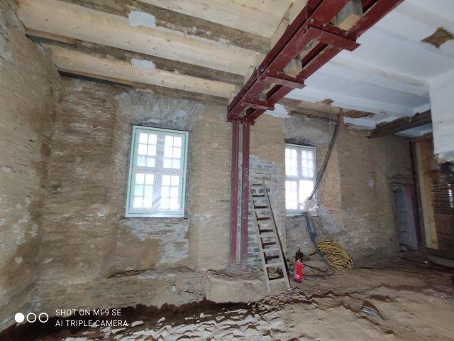 Das Vermauern von lehmsteinen geht jetzt am linken Giebel weiter. Wichtig hierbei ist, dass die Anschlüsse zum Holzwerk, vor allem im Bereich der Dreikantleisten voll ausgemörtelt werden. Da ein natürliches „Abreissen“ des Mörtels vom Holz erfolgt, ist das die einzige wirkliche Verzahnung und Lagesicherung der Gefachefüllung und somit ausschlaggebend für nachträgliche Fugenausbildung und Haltbarkeit der Kalkputzfugen.