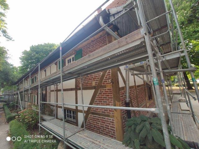 Das Vermauern von lehmsteinen geht jetzt am linken Giebel weiter. Wichtig hierbei ist, dass die Anschlüsse zum Holzwerk, vor allem im Bereich der Dreikantleisten voll ausgemörtelt werden. Da ein natürliches „Abreissen“ des Mörtels vom Holz erfolgt, ist das die einzige wirkliche Verzahnung und Lagesicherung der Gefachefüllung und somit ausschlaggebend für nachträgliche Fugenausbildung und Haltbarkeit der Kalkputzfugen.