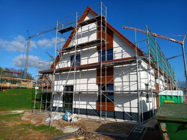 Das Vermauern von lehmsteinen geht jetzt am linken Giebel weiter. Wichtig hierbei ist, dass die Anschlüsse zum Holzwerk, vor allem im Bereich der Dreikantleisten voll ausgemörtelt werden. Da ein natürliches „Abreissen“ des Mörtels vom Holz erfolgt, ist das die einzige wirkliche Verzahnung und Lagesicherung der Gefachefüllung und somit ausschlaggebend für nachträgliche Fugenausbildung und Haltbarkeit der Kalkputzfugen.