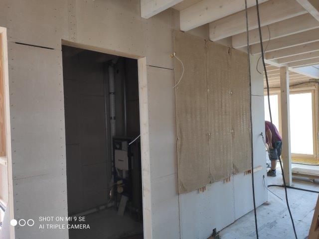 Das Vermauern von lehmsteinen geht jetzt am linken Giebel weiter. Wichtig hierbei ist, dass die Anschlüsse zum Holzwerk, vor allem im Bereich der Dreikantleisten voll ausgemörtelt werden. Da ein natürliches „Abreissen“ des Mörtels vom Holz erfolgt, ist das die einzige wirkliche Verzahnung und Lagesicherung der Gefachefüllung und somit ausschlaggebend für nachträgliche Fugenausbildung und Haltbarkeit der Kalkputzfugen.