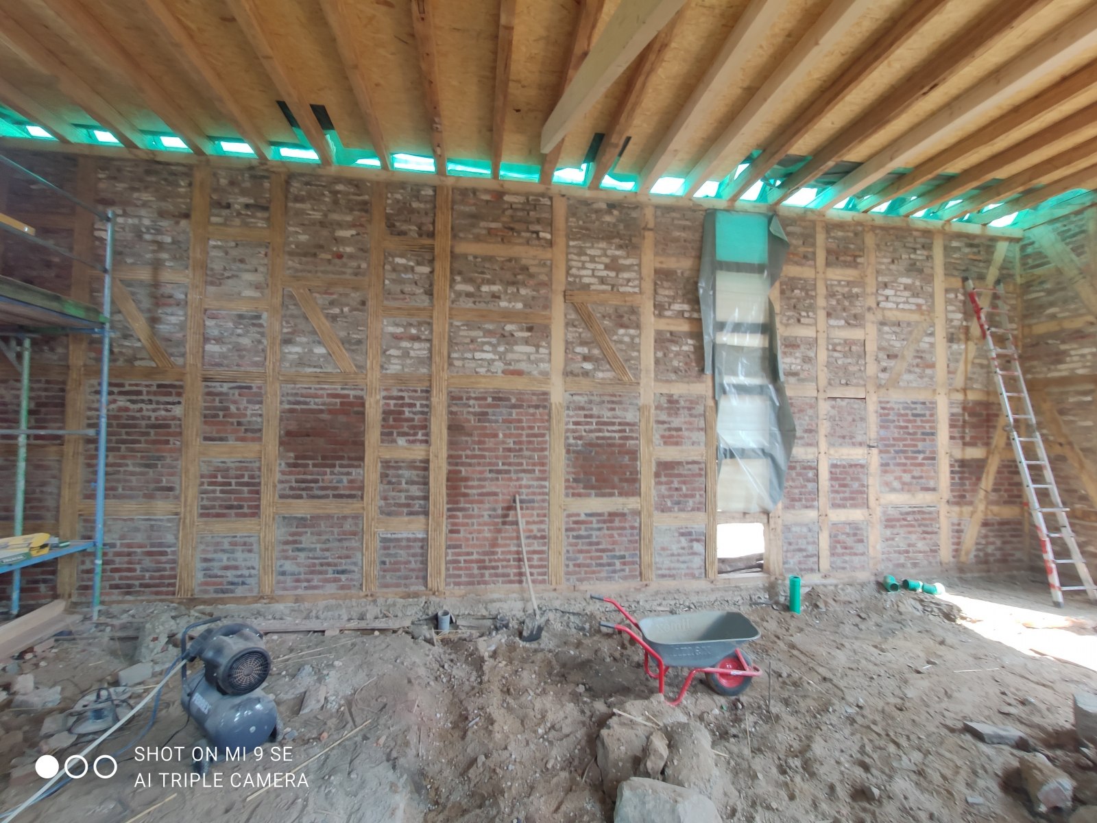Das Vermauern von lehmsteinen geht jetzt am linken Giebel weiter. Wichtig hierbei ist, dass die Anschlüsse zum Holzwerk, vor allem im Bereich der Dreikantleisten voll ausgemörtelt werden. Da ein natürliches „Abreissen“ des Mörtels vom Holz erfolgt, ist das die einzige wirkliche Verzahnung und Lagesicherung der Gefachefüllung und somit ausschlaggebend für nachträgliche Fugenausbildung und Haltbarkeit der Kalkputzfugen.