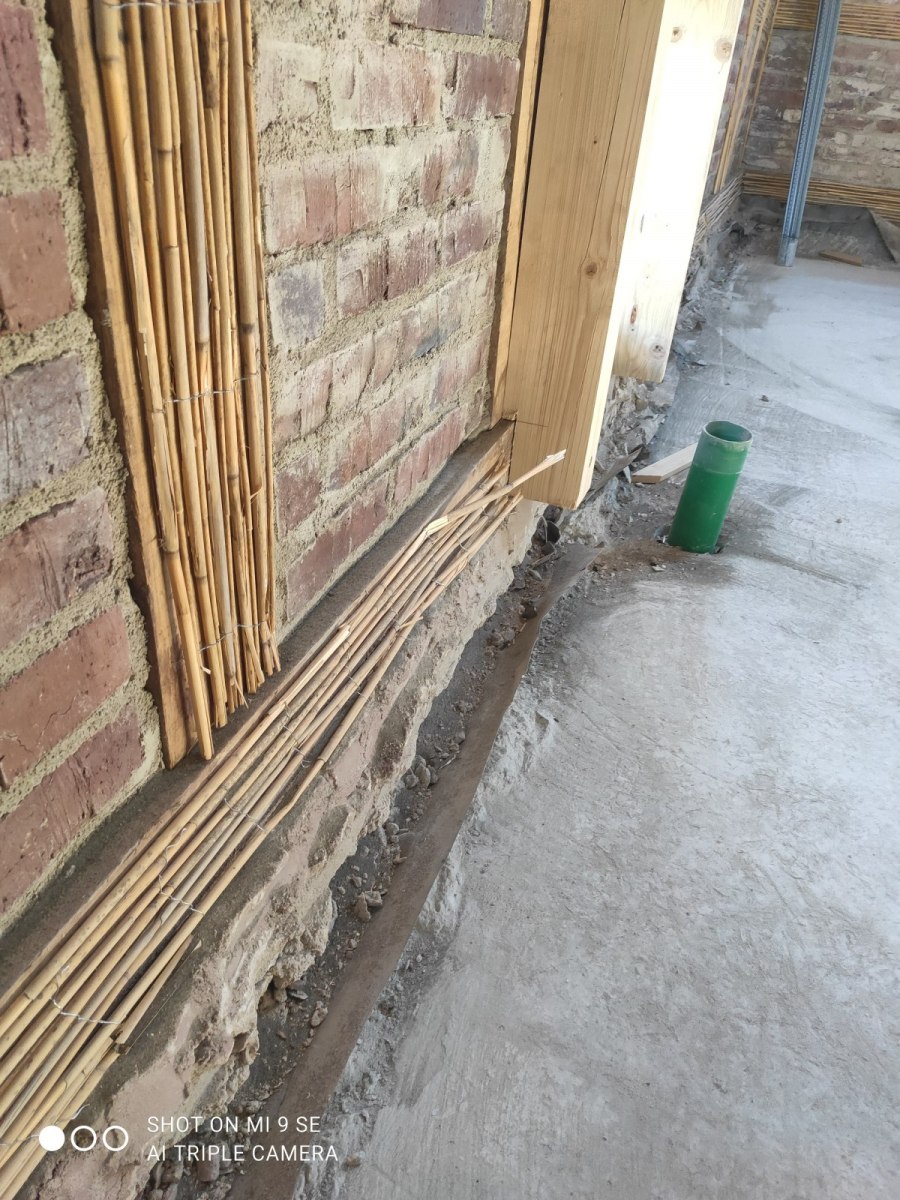 Das Vermauern von lehmsteinen geht jetzt am linken Giebel weiter. Wichtig hierbei ist, dass die Anschlüsse zum Holzwerk, vor allem im Bereich der Dreikantleisten voll ausgemörtelt werden. Da ein natürliches „Abreissen“ des Mörtels vom Holz erfolgt, ist das die einzige wirkliche Verzahnung und Lagesicherung der Gefachefüllung und somit ausschlaggebend für nachträgliche Fugenausbildung und Haltbarkeit der Kalkputzfugen.