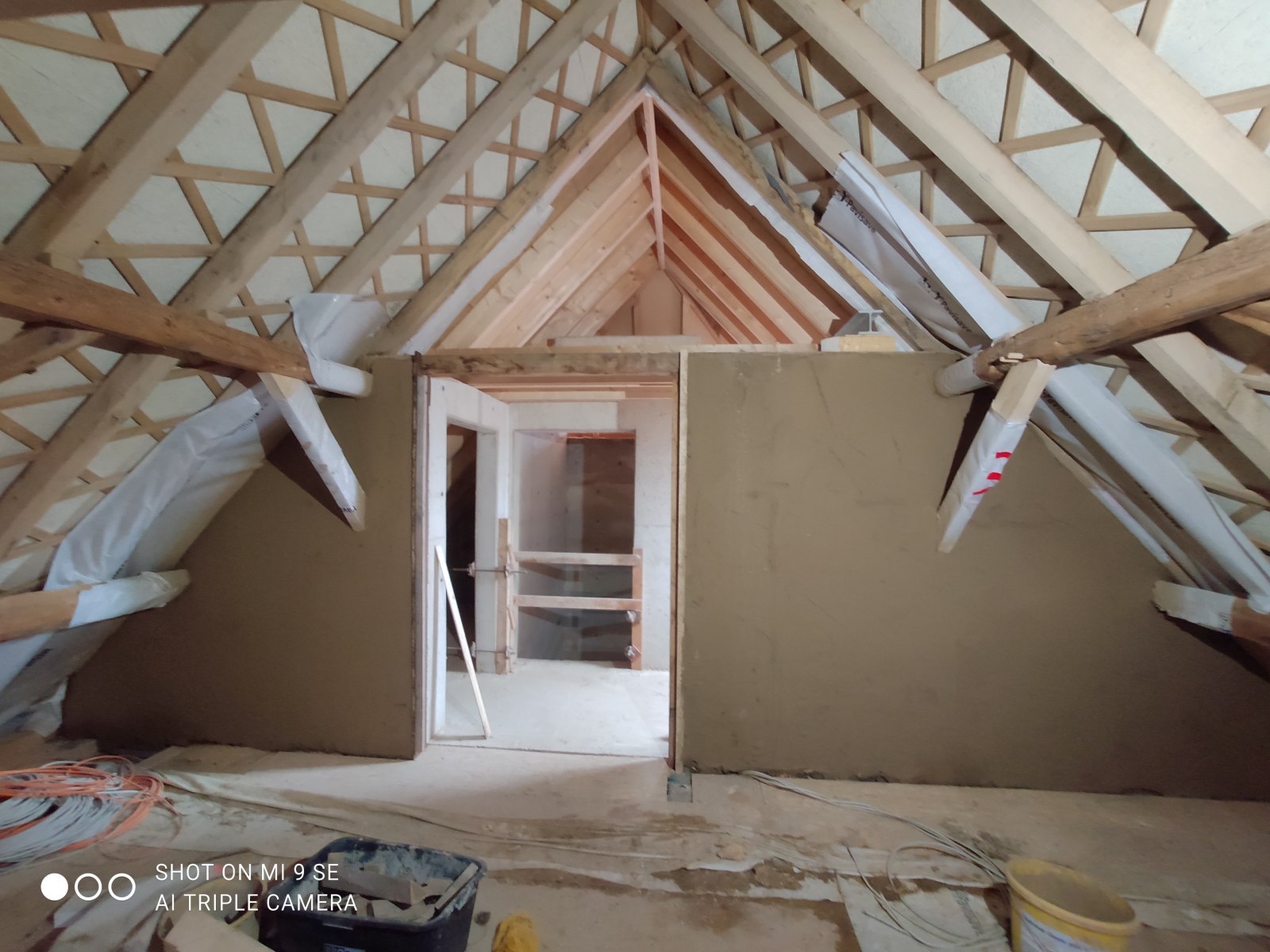 Das Vermauern von lehmsteinen geht jetzt am linken Giebel weiter. Wichtig hierbei ist, dass die Anschlüsse zum Holzwerk, vor allem im Bereich der Dreikantleisten voll ausgemörtelt werden. Da ein natürliches „Abreissen“ des Mörtels vom Holz erfolgt, ist das die einzige wirkliche Verzahnung und Lagesicherung der Gefachefüllung und somit ausschlaggebend für nachträgliche Fugenausbildung und Haltbarkeit der Kalkputzfugen.