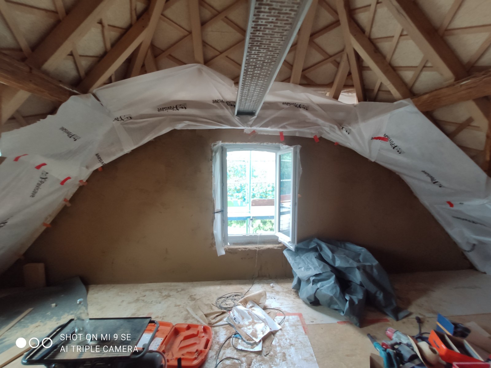 Das Vermauern von lehmsteinen geht jetzt am linken Giebel weiter. Wichtig hierbei ist, dass die Anschlüsse zum Holzwerk, vor allem im Bereich der Dreikantleisten voll ausgemörtelt werden. Da ein natürliches „Abreissen“ des Mörtels vom Holz erfolgt, ist das die einzige wirkliche Verzahnung und Lagesicherung der Gefachefüllung und somit ausschlaggebend für nachträgliche Fugenausbildung und Haltbarkeit der Kalkputzfugen.