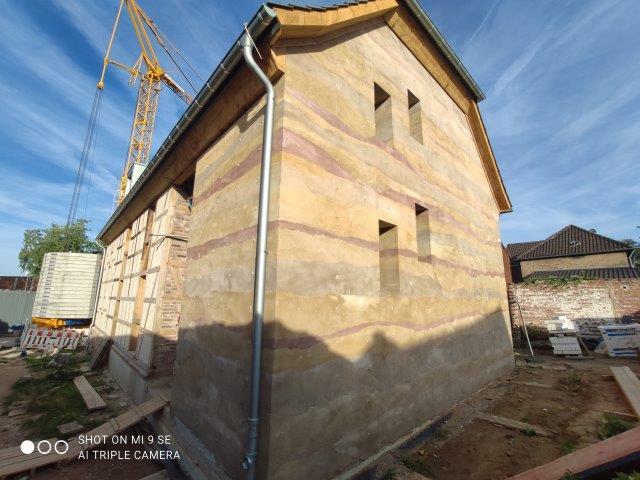Das Vermauern von lehmsteinen geht jetzt am linken Giebel weiter. Wichtig hierbei ist, dass die Anschlüsse zum Holzwerk, vor allem im Bereich der Dreikantleisten voll ausgemörtelt werden. Da ein natürliches „Abreissen“ des Mörtels vom Holz erfolgt, ist das die einzige wirkliche Verzahnung und Lagesicherung der Gefachefüllung und somit ausschlaggebend für nachträgliche Fugenausbildung und Haltbarkeit der Kalkputzfugen.