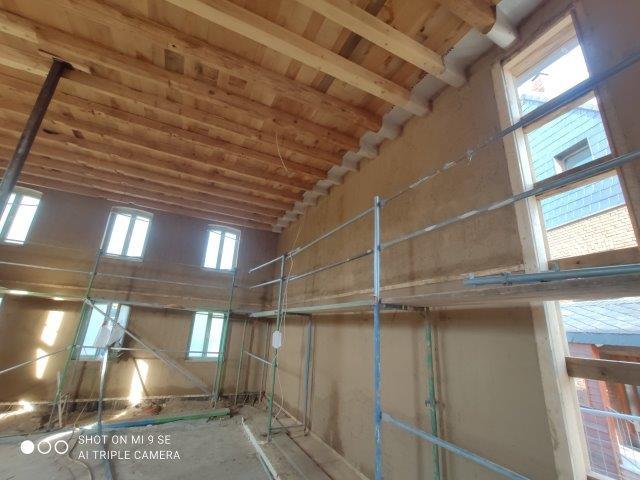 Das Vermauern von lehmsteinen geht jetzt am linken Giebel weiter. Wichtig hierbei ist, dass die Anschlüsse zum Holzwerk, vor allem im Bereich der Dreikantleisten voll ausgemörtelt werden. Da ein natürliches „Abreissen“ des Mörtels vom Holz erfolgt, ist das die einzige wirkliche Verzahnung und Lagesicherung der Gefachefüllung und somit ausschlaggebend für nachträgliche Fugenausbildung und Haltbarkeit der Kalkputzfugen.
