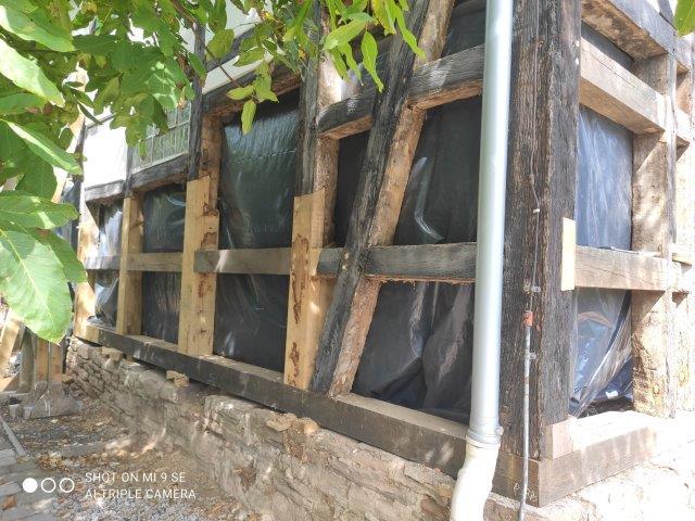Das Vermauern von lehmsteinen geht jetzt am linken Giebel weiter. Wichtig hierbei ist, dass die Anschlüsse zum Holzwerk, vor allem im Bereich der Dreikantleisten voll ausgemörtelt werden. Da ein natürliches „Abreissen“ des Mörtels vom Holz erfolgt, ist das die einzige wirkliche Verzahnung und Lagesicherung der Gefachefüllung und somit ausschlaggebend für nachträgliche Fugenausbildung und Haltbarkeit der Kalkputzfugen.