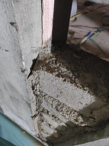 Das Vermauern von lehmsteinen geht jetzt am linken Giebel weiter. Wichtig hierbei ist, dass die Anschlüsse zum Holzwerk, vor allem im Bereich der Dreikantleisten voll ausgemörtelt werden. Da ein natürliches „Abreissen“ des Mörtels vom Holz erfolgt, ist das die einzige wirkliche Verzahnung und Lagesicherung der Gefachefüllung und somit ausschlaggebend für nachträgliche Fugenausbildung und Haltbarkeit der Kalkputzfugen.