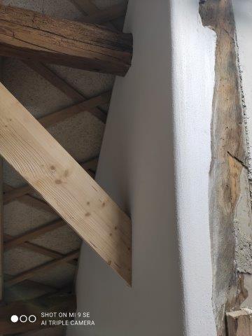 Das Vermauern von lehmsteinen geht jetzt am linken Giebel weiter. Wichtig hierbei ist, dass die Anschlüsse zum Holzwerk, vor allem im Bereich der Dreikantleisten voll ausgemörtelt werden. Da ein natürliches „Abreissen“ des Mörtels vom Holz erfolgt, ist das die einzige wirkliche Verzahnung und Lagesicherung der Gefachefüllung und somit ausschlaggebend für nachträgliche Fugenausbildung und Haltbarkeit der Kalkputzfugen.