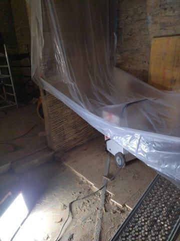 Das Vermauern von lehmsteinen geht jetzt am linken Giebel weiter. Wichtig hierbei ist, dass die Anschlüsse zum Holzwerk, vor allem im Bereich der Dreikantleisten voll ausgemörtelt werden. Da ein natürliches „Abreissen“ des Mörtels vom Holz erfolgt, ist das die einzige wirkliche Verzahnung und Lagesicherung der Gefachefüllung und somit ausschlaggebend für nachträgliche Fugenausbildung und Haltbarkeit der Kalkputzfugen.