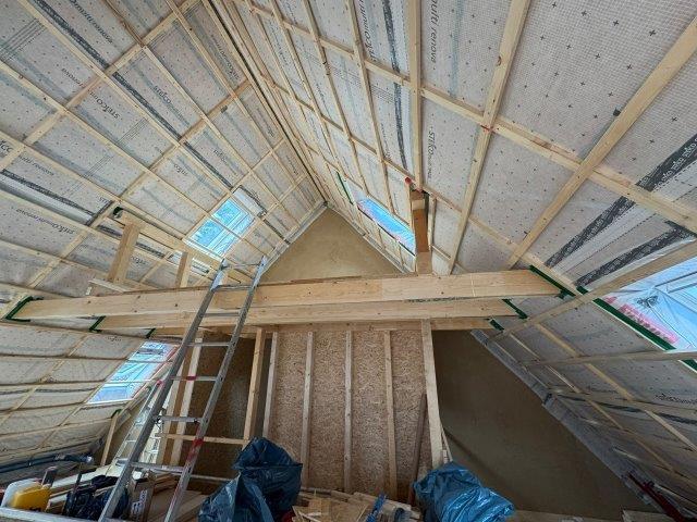 Hier wurde ein neues Dach gerichtet, welches wir mit Holzfaserdämmstoffen und geeigneten Dampfbremsen gedämmt haben. Verwendet wurde hier Steico-Flex mit 20cm an Dachschrägen und in den von uns zu erstellenden Trennwänden werden auch Holzfaserdämmstoffe verbaut. Die Beplankung erfolgt aus Kostengründen erstmal mit normalen Gipskartonplatten, welche dann aber alle mit Lehmmörtel verputzt werden.