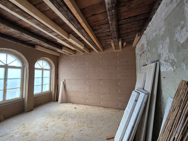 Aufgrund der denkmalgeschützten Bausubstanz und des labilen Mauerwerks ist die statische Sicherung der Dämmplatten besonders anspruchsvoll.