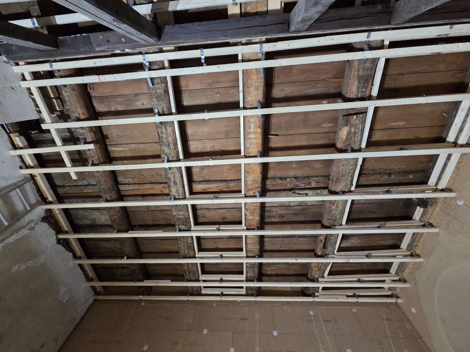 Nachdem wir im vergangenen Jahr bereits die Innenwanddämmung erfolgreich abgeschlossen haben – ein nachhaltiges System aus Lehmmörtel und verschraubten Holzfaserdämmplatten – geht es nun in die nächste spannende Phase: den Einbau der Heiz- und Kühldecken.
