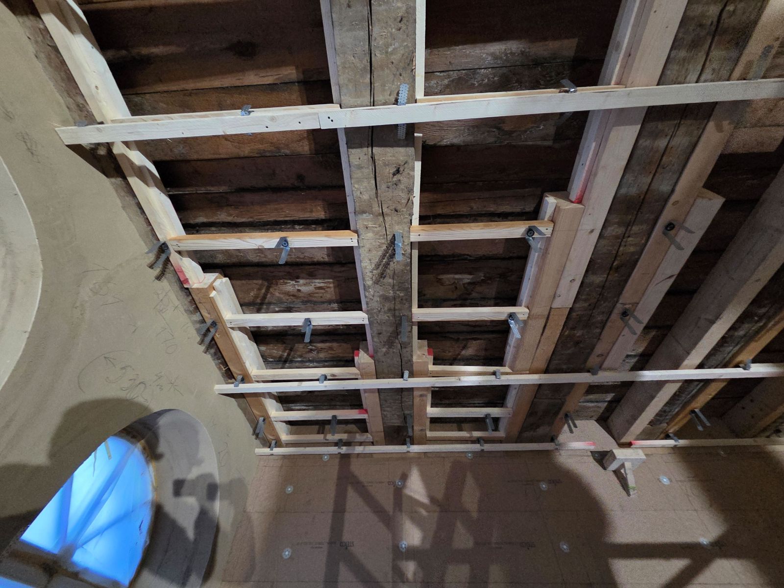 Nachdem wir im vergangenen Jahr bereits die Innenwanddämmung erfolgreich abgeschlossen haben – ein nachhaltiges System aus Lehmmörtel und verschraubten Holzfaserdämmplatten – geht es nun in die nächste spannende Phase: den Einbau der Heiz- und Kühldecken.