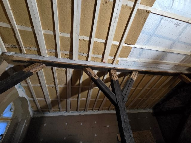 Denkmalschutz trifft Moderne: Hier ist die Vorbereitung der Dachschrägen mit ökologischer Dämmung und der tragenden Holzlatten-Konstruktion zu sehen.