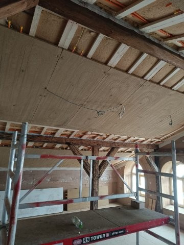 - Nachhaltige Innendämmung: Um den Wärmeschutz im Dachgeschoss und an den Außenwänden zu optimieren, kamen ökologische Dämmplatten zum Einsatz. Diese sind kapillaraktiv und passen sich perfekt an das historische Holzgebälk an.