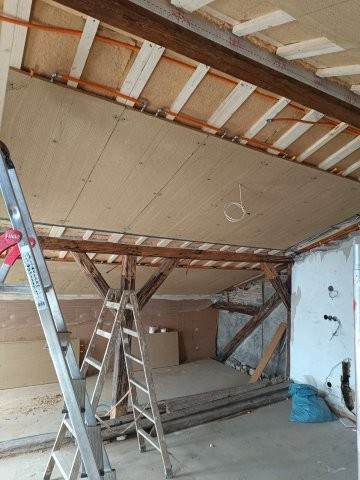 • Nachhaltige Innendämmung: Um den Wärmeschutz im Dachgeschoss und an den Außenwänden zu optimieren, kamen ökologische Dämmplatten zum Einsatz. Diese sind kapillaraktiv und passen sich perfekt an das historische Holzgebälk an.