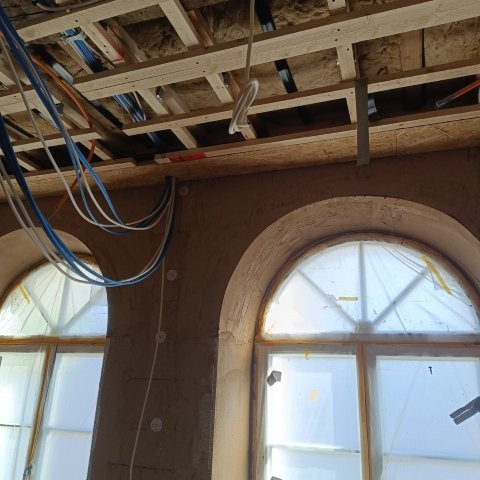 • Dachgeschoss: Beginn der Putzarbeiten mit Lehmarmierung.