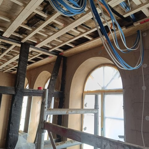 • Dachgeschoss: Beginn der Putzarbeiten mit Lehmarmierung.