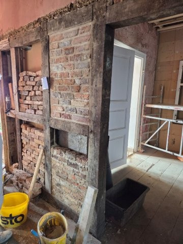 Ein besonderes Highlight ist das Sichtmauerwerk im freigelegten Holzgefach. Hier leben wir echte Nachhaltigkeit: Wir verwenden die im Haus abgebrochenen Ziegelsteine. Nach einer gründlichen Reinigung werden diese mit traditionellem Kalkmörtel sichtbar vermauert.