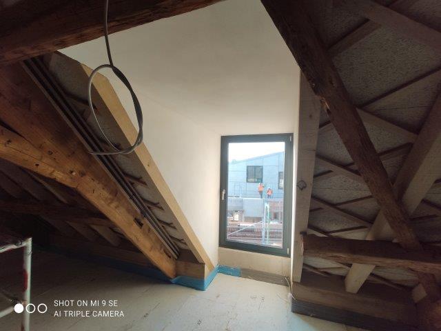 Wie in einem Denkmal üblich, sind die Spuren der Vergangenheit irgendwie zu erhalten, oder wie hier, wenigsten „anzudeuten“. Da die alte Balkenlage über dem EG vollständig zerstört war, eine Neue Abgrenzung durch einen modernen Stahlbau eine sinnvollere Nutzung erlaubte, sollte sich wenigstens die Position der alten Balkenlage im neuen Putz als „Schatten“ wiederfinden – dies haben wir frescal in die zweite Lage Oberputz eingearbeitet….